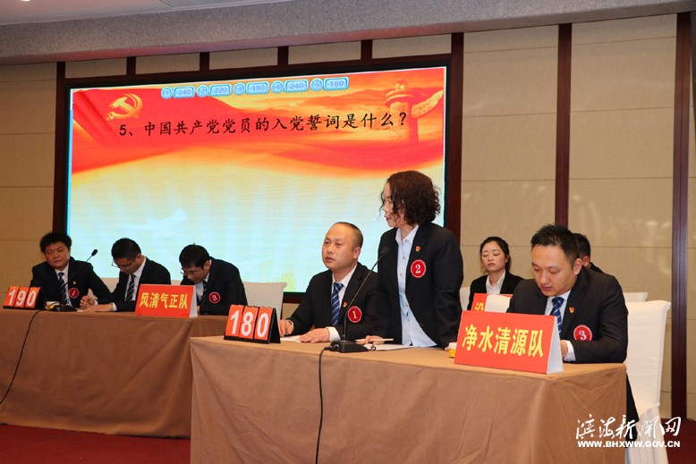 本次党建知识竞赛共有风清气正队(水务公司选派)、求实创新队(县城水司选派)、沿海先锋队(沿海水司选派)、饮水思源队(渠南水司选派)、净水清源队(县城污水厂选派)参赛。竞赛采用现场抽题、现场答题、现场计分方式进行,设置必答题、抢答题、风险题和加试题等环节。