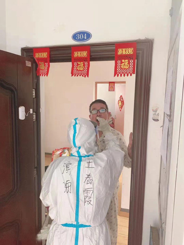 7月25日,我们转战到江宁区禄口街道这个此次疫情始发地。每天早上5:30,第一滴汗在头发梢上滴下的时候,我们就出发,穿着防护服、抱着检测物资,走在去向居民家的路上。然后,在当地社区志愿者带领下,敲开一户户的门,看到一张张表情不安的脸孔,开始核检,并带走一支支样本。“张嘴”“啊”“好了”每天要说几百遍,最多的有上千遍。晚上结束后,有的同事感到头晕。我们知道,那其实就是热得轻度中暑的症状啊!而我,当时也只觉得口舌艰难到像被胶水粘住一般。但是,大家明白,所有身体上的劳累,都不值得言说!真的,当作为一名支援抗疫的“战士”奔赴战场之时,这一切就全都在他们的意料之中。