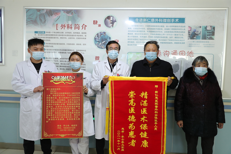 “谢谢!谢谢你们!你们是我父亲的救命恩人。”一大早,李大爷的儿子就将印有“精湛医术保健康 崇高医德为患者”字样的锦旗和红彤彤的感谢信送到滨海新仁慈医院外科,并连声表示感谢。该院外科主任吴志海、护士长路从慧连忙接过,回应道:“这都是我们应该做的,谢谢您对我们的认可和支持!”在场的医护人员无不为李大爷的康复出院而感到高兴。
