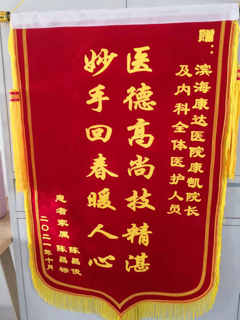 日前,康达医院心内科专家门诊上演温馨的一幕。两位中年男子满面春风手捧一面写着“医德高尚技精湛,妙手回春暖人心”的锦旗递到主任医师、业务院长康凯手里,激动地说:“非常感谢康院长治好我母亲的病,解除老人家久治不愈的病痛,提升了我们全家人的生活质量,感谢您及病区医护人员……”患者亲人的肺腑之言,彰显的是医患之间的真诚与和谐。