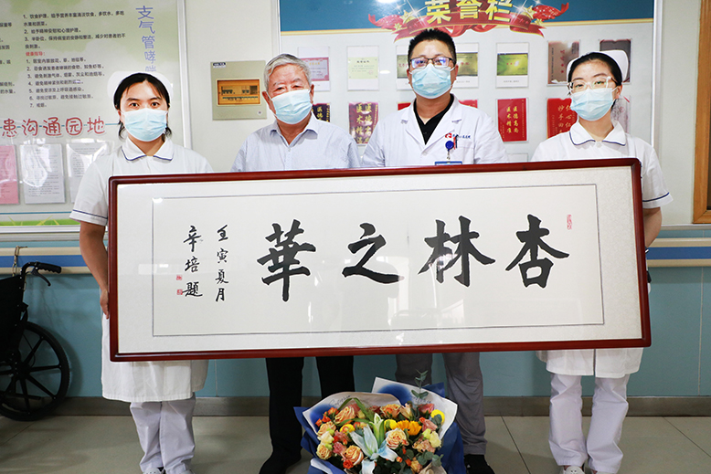 患者辛某,男,71岁,去年年底在外地医院做了心脏支架植入手术,今年6月患者突感胸闷心慌、时有头晕等症状,后住该院治疗。6月16日,医院为他行冠状动脉造影术及经皮冠状动脉介入治疗手术,术后他恢复良好。为表示感谢,辛大爷还书写一幅字赠予医护人员。