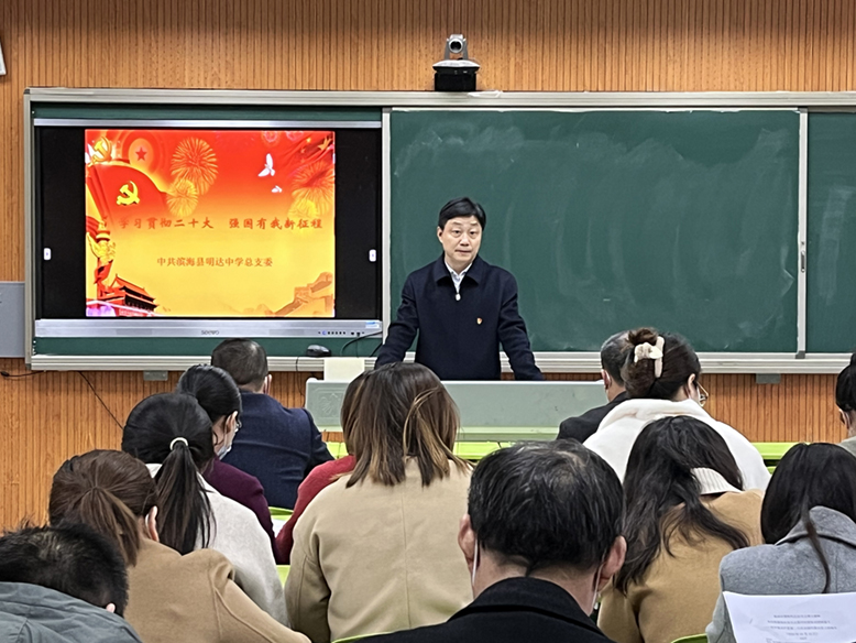该校党总支书记、校长周立军向全体党员宣讲党的二十大精神。周立军逐字逐句宣讲二十大报告相关内容,并结合教育工作实际,阐述二十大报告对学校提升质量、办人民满意教育的重要指导意义。他语重心长地对明达中学党员提出三点要求。一是希望大家做带头学习的先行者,认真学习宣传贯彻二十大报告精神;二是做教育教学改革的践行者,以二十大精神为指引,扎实开展教研活动,积极推进课堂教学改革,提高教学实效;三是做务实作风的标杆者,亮身份,敢担当,发挥带头作用,引领全体教职员工共同推动学校发展。