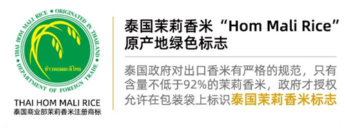 泰国商业部外贸厅注册了泰国香米质量标准认证标志:Thai Hom Mali Rice(泰国茉莉香米)绿色圆形的原产地注册标志。