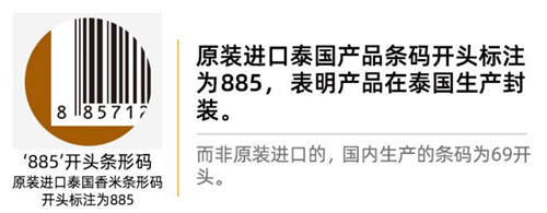原产地包装原装进口泰国香米的包装条形码以88开头,“69”条码的泰国茉莉香米则是在国内分装的。