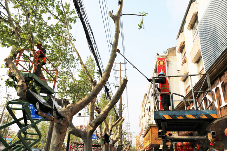 园林绿化修剪工对阜东路法桐进行统一修剪,致力美化树形。
