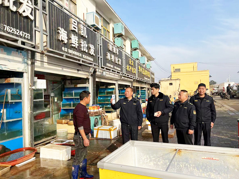 执法队员对农贸批发市场店外出摊经营户进行入室经营劝导。