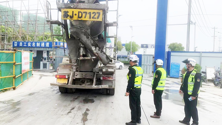 执法队员在香坎家园工地摸排搅拌车出料槽处安装料斗箱情况。