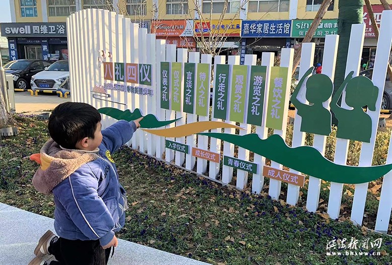 “囡囡,我们在游园的时候一定要遵守‘游览之礼’哦,爱护公物,不折花草,礼让他人,争做新时代美德好少年!”市民刘燕指着“八礼四仪”宣传牌对女儿说道。