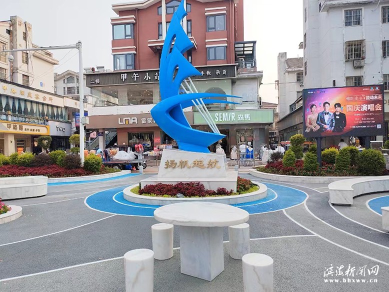 扬帆起航公园位于县城新建中路,面积约387平方米。紧邻滨海宾馆和银厦广场,周边环绕居住区和商业街,位置优越,成为人流汇聚的公共开放空间。